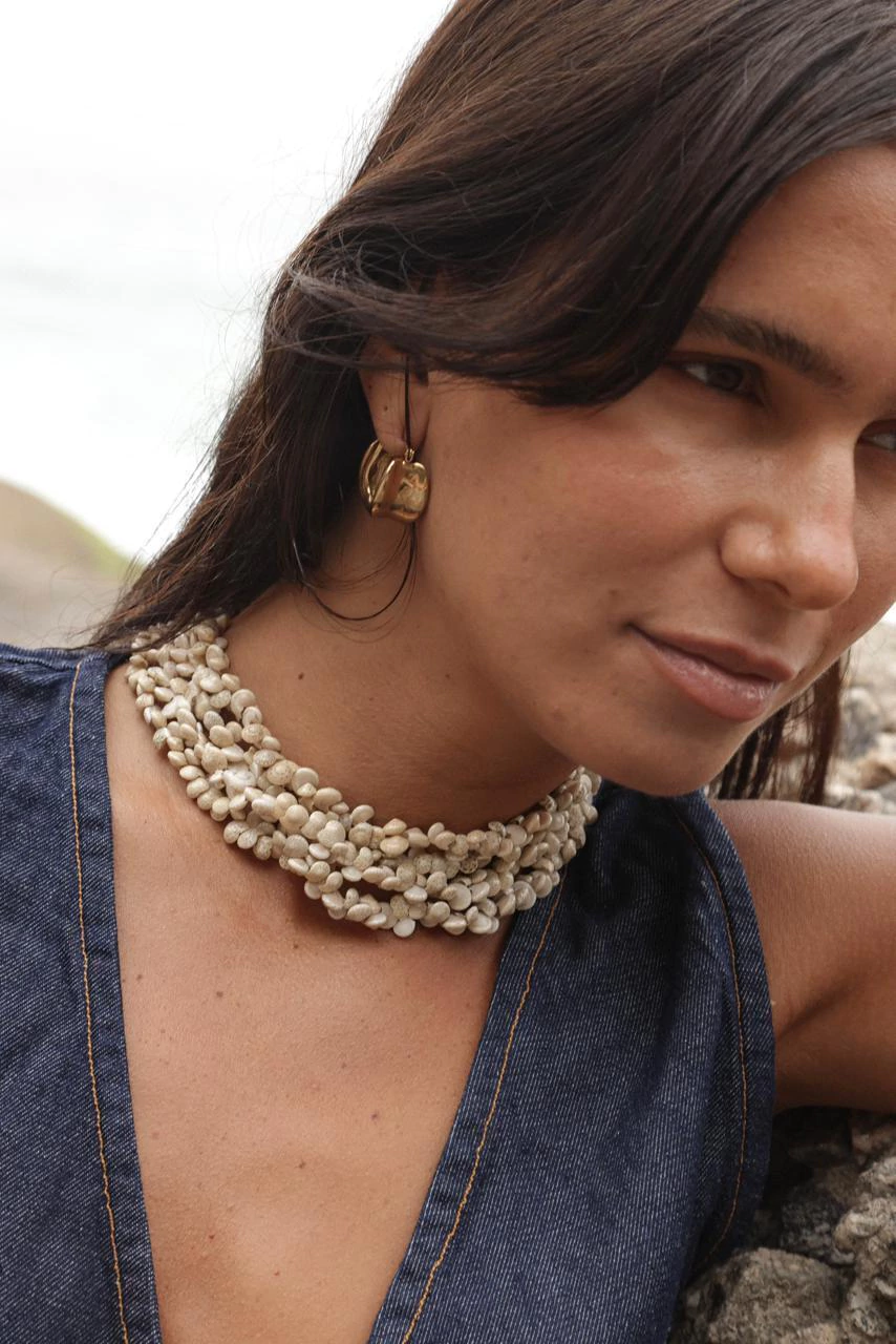 Multicollar corto de caracoles. Combinamos la sutileza del nácar en su tonalidad original con cordón soga en marrón que permite ajustarlo cómodamente. Diseñado en cuatro capas para sumar un toque de volumen y textura a cualquier look.