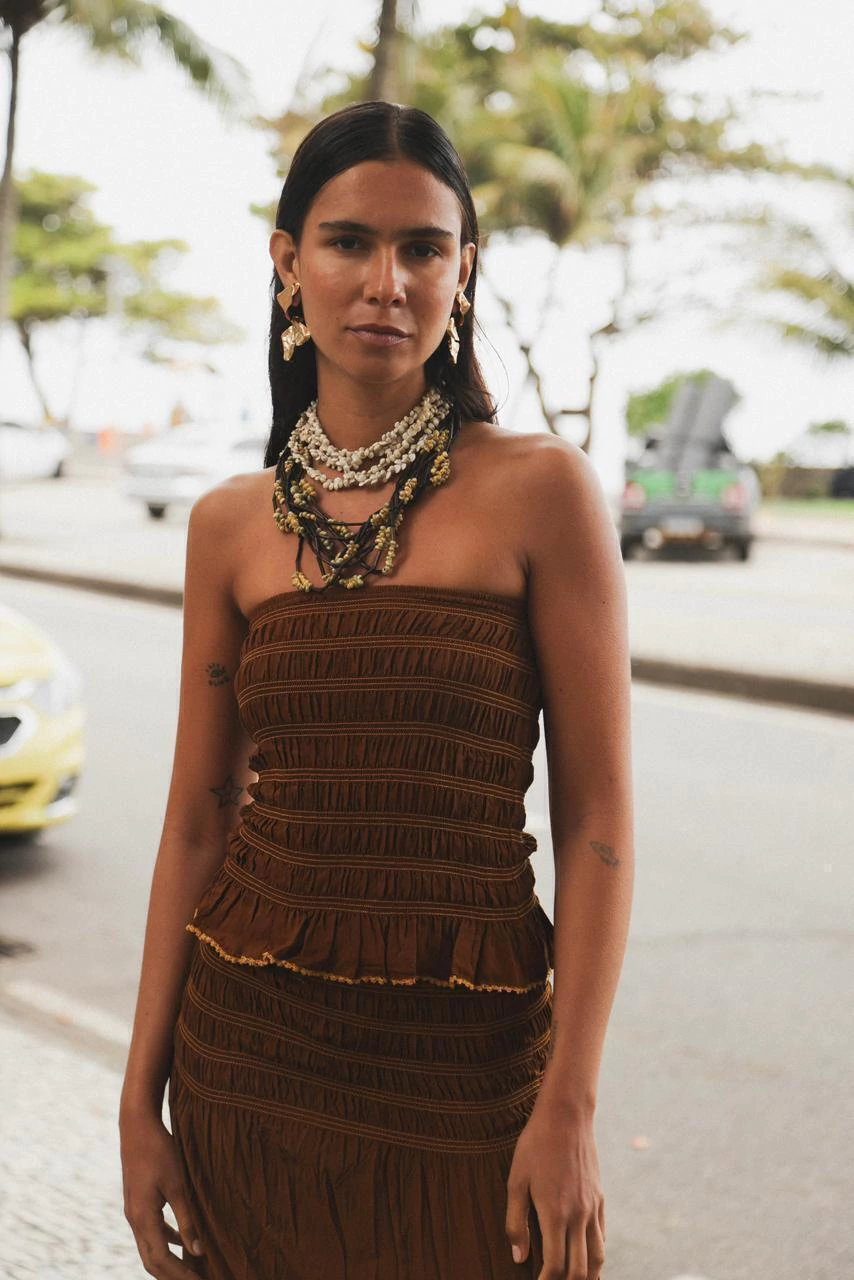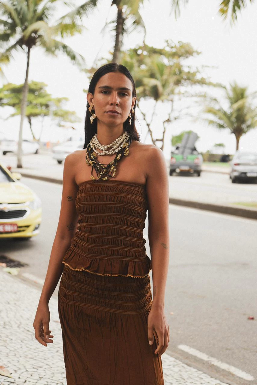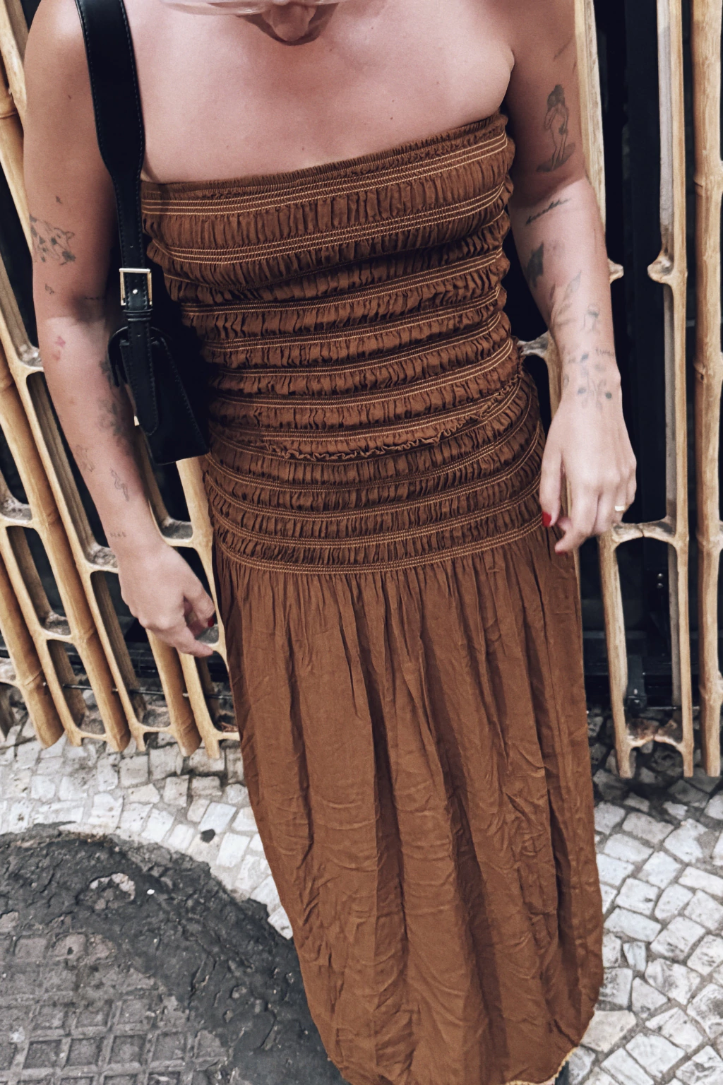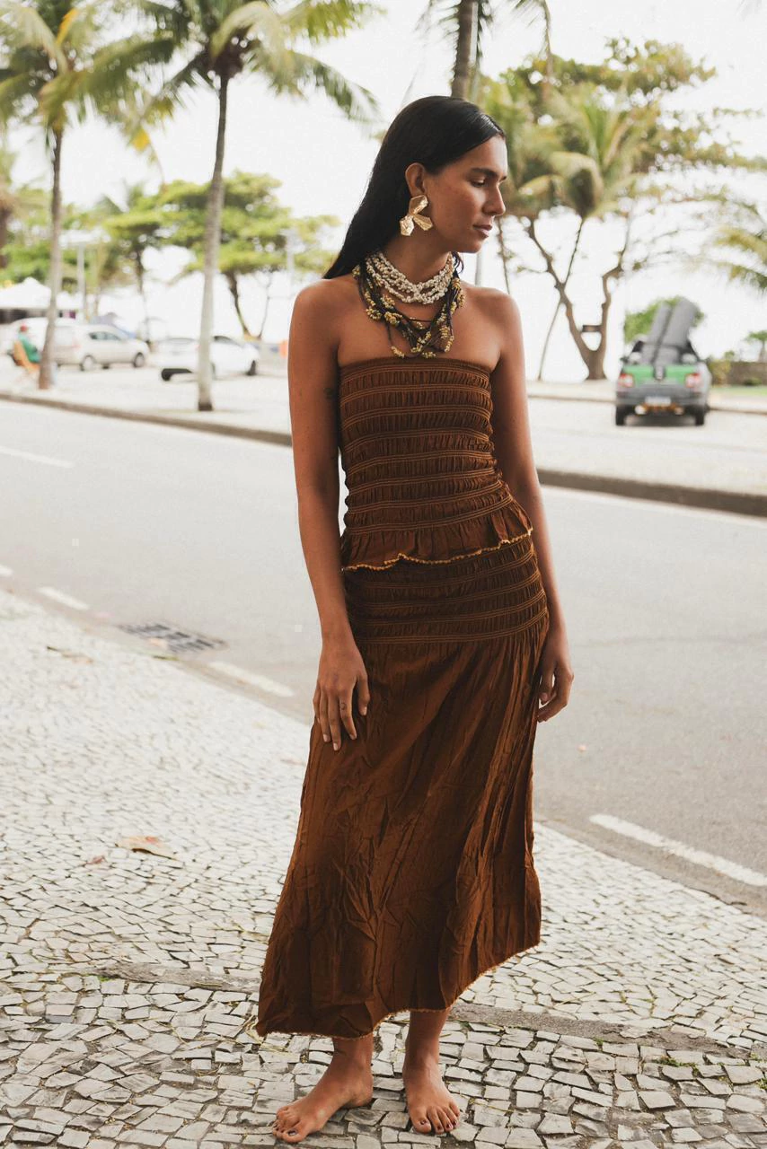 Falda larga marrón con volado sutil en caderin. Confeccionado en un género súper liviano y fresco. Ideal para combinar con strapless o musculosa marrón GR del mismo género.