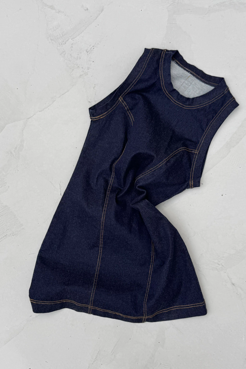 Vestido estilo jackie corto y sin mangas confeccionado en denim elastizado. Con fijación de color para mantener el color original del denim que es tendencia.